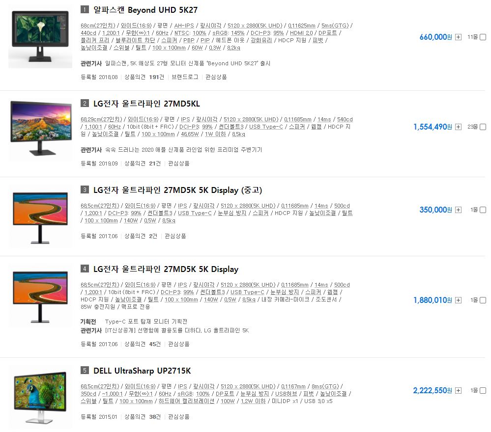 2020-08-23일자 기준, 5K 모니터의 가격