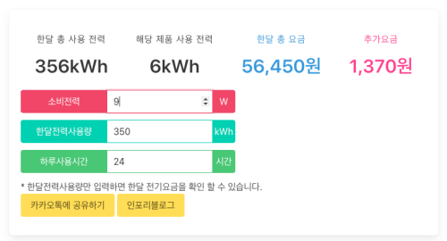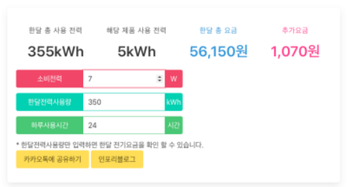 현재 판매중인 제품들을 기준으로 예상 전기요금을 계산하면 아래와 같다.