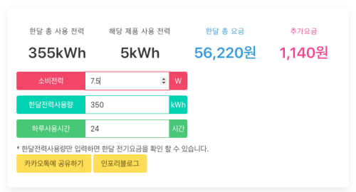 위의 표처럼 전기요금 소비전력이 낮아 추가되는 전기요금은 천원 전후로 낮다.
