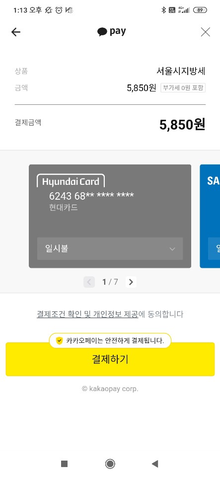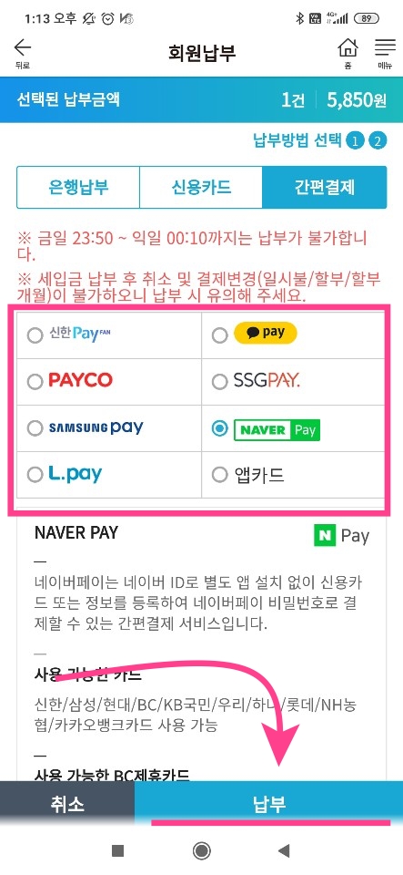 그후 은행/신용카드/간편결제 납부 중 선택해서 결제를 진행하면 된다.