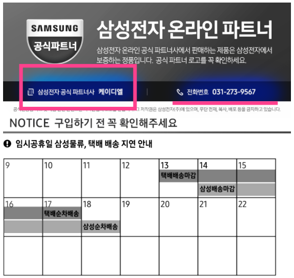 해당 제품의 판매자의 사업자 정보를 살펴보면 '에스아이글로벌'이라고 표기가 되어있는데 상세페이지의 삼성전자 온라인 파트너를 보면 '케이디엘'이라고 엉뚱한 업체이름과 번호가 되어 있다.