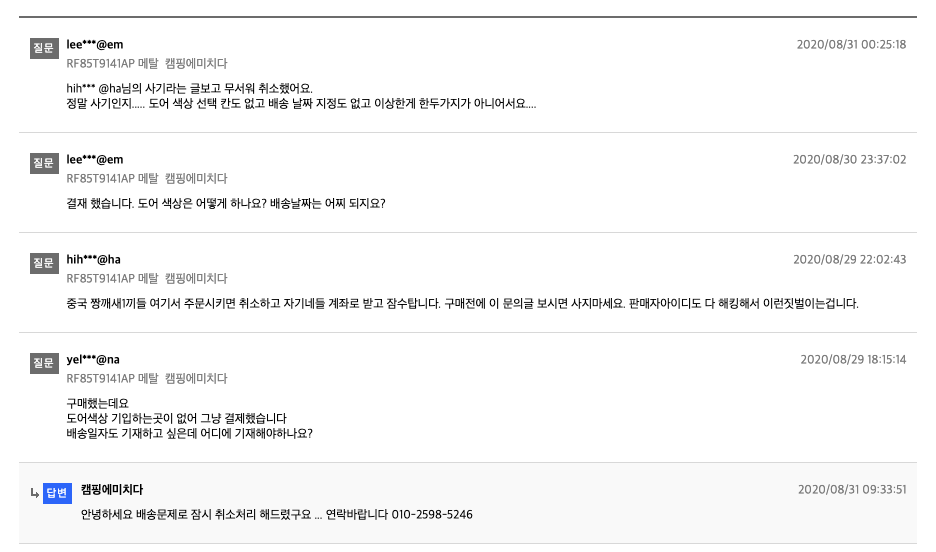 마지막 후기를 보면 또 판매자 정보가 '캠핑에 미치다'로 바뀌고 배송문제로 '취소처리'를 하더니 결국 '전화'를 유도하고 있다.