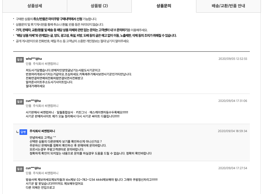 구매하면 안되는 쿠팡 판매자 : 쿠팡사기꾼 판매제품들(후기를 보면 사기 피해를 입은 사람들의 문의글을 볼 수 있다.)