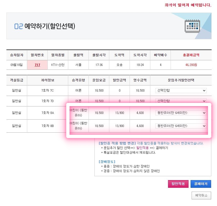 동반유아는 코레일에 가입해서 결제를 하면 자동으로 할인이 된다.