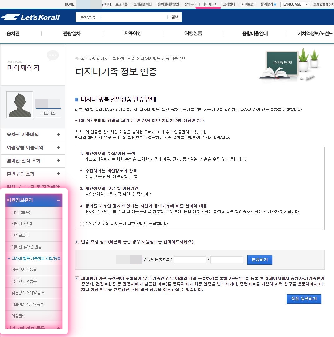 다자녀를 증명해야하는 만큼 별도로 역창구 또는 홈페이지를 통해 '인증'절차를 거친 후 할인 선택이 가능하다.