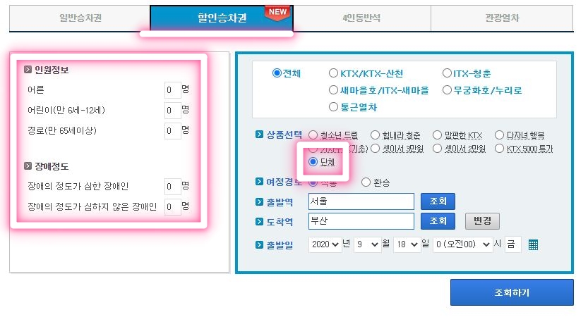 | 할인적용 | PC 통한 예매 www.letskorail.com > 승차권 > 단체할인 선택 > 인원정보에 10명이상 선택 후 조회 후 예매 진행 앱을 통한 예매는 불가능 |