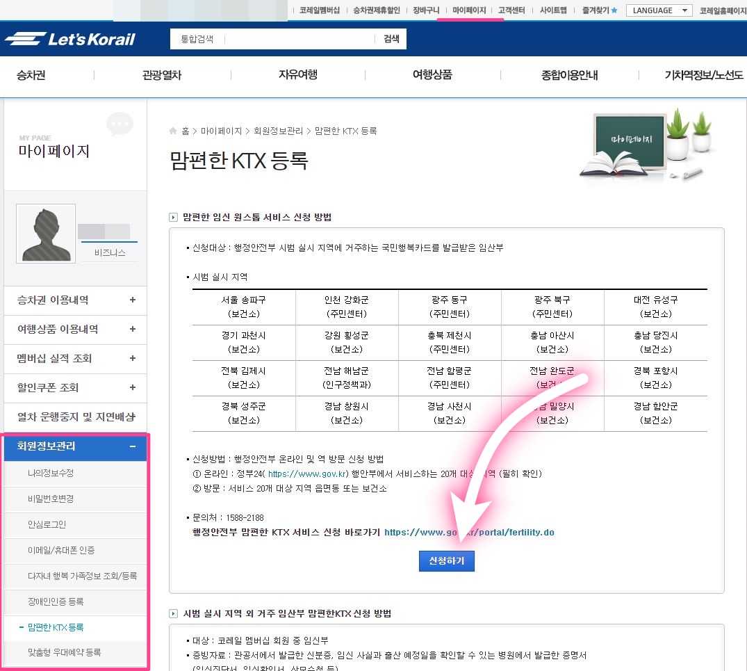 | 인증방법 | 직접 역 창구에 방문 - 역 창구에서 임신확인서(또는 임신진단서_사본 가능), 신분증(주민등록증, 운전면허증, 여권 등)를 제시하고 등록 ( 대리 등록도 가능 ) 홈페이지를 통해 인증 - www.letskorail.com > 마이페이지 > 회원정보관리 > 맘편한 KTX 등록 |