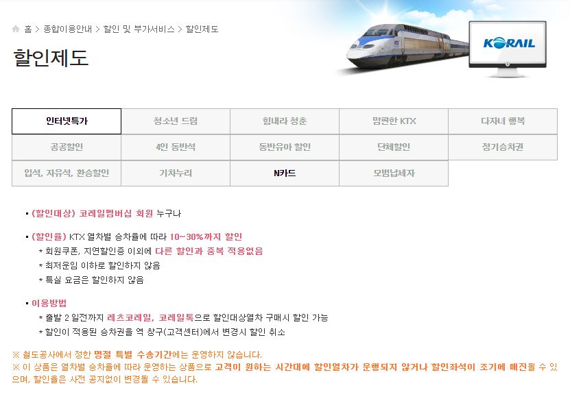 | 상품소개 | KTX의 열차 승차율에 따라 할인율이 결정된다. 공석을 활용하는 제도라 공석이 없는 황금시간대는 할인이 없을 수 있다. |