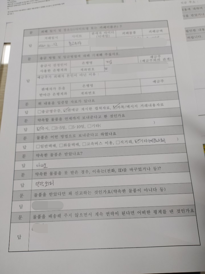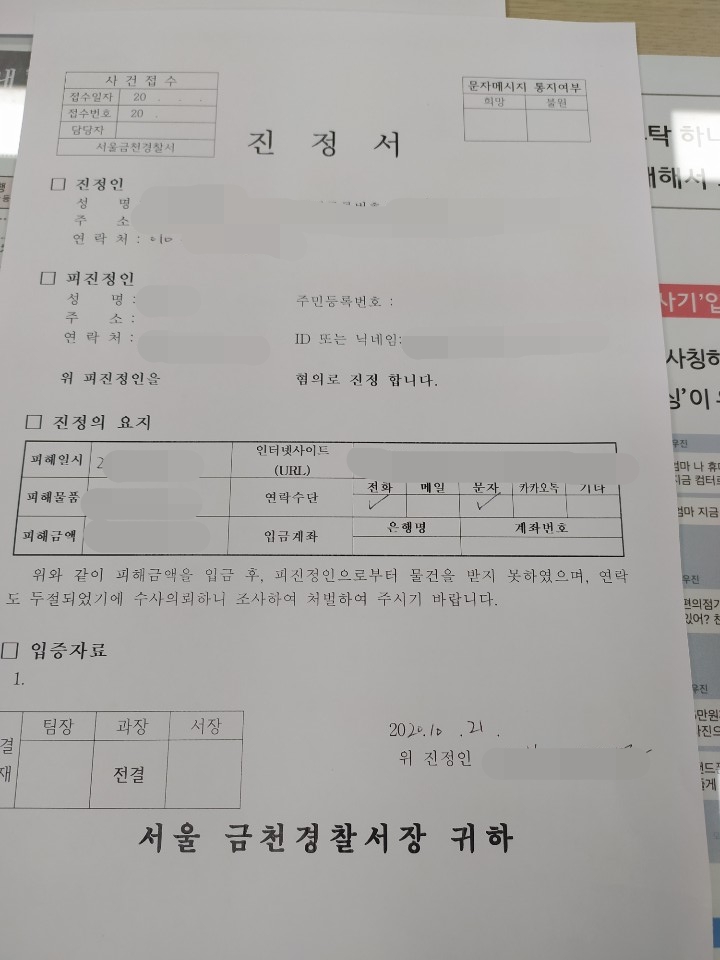 그리고 사기과정에 대한 부분을 경찰서 방문 후 양식에 따라 작성을 하는데 방문 전 미리 상세하게 정리 하는게 좋다.