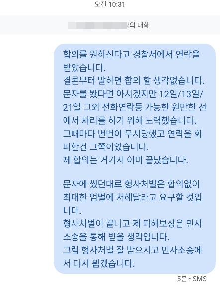 번거로운 절차때문에 문자로 경찰서간다고 협박(?)도 해보고 전화도 했지만 그때마다 번번이 무시했던 사람이 경찰서에 잡히자마자 합의라니..