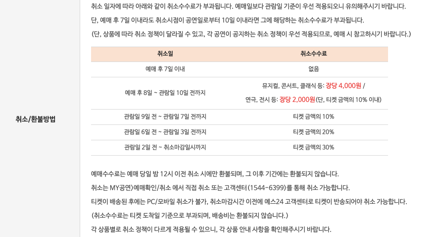 5. 관람일에 따라 0원에서 ~ 최대 티켓 금액의 30% 까지 취소 수수료 발생