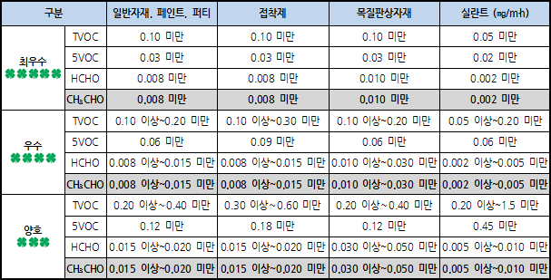 | E0 | 0.5mg/L 이하 | 환경부 환경마크 인증 수준(0.5mg/L 이하) |