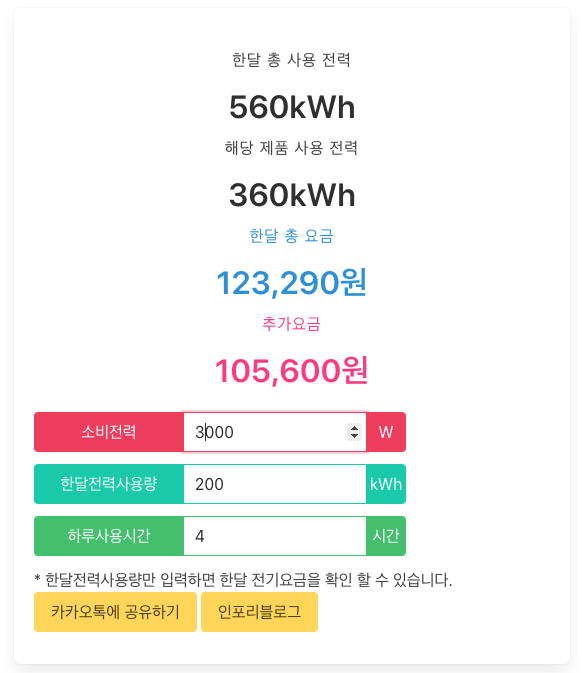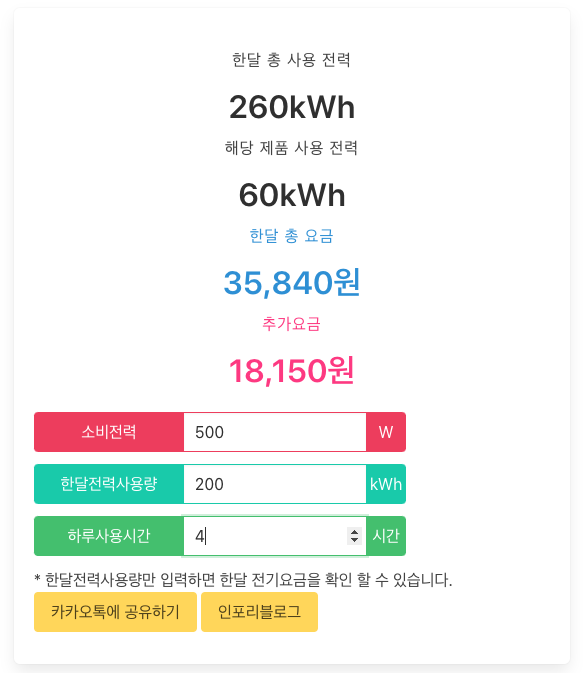 이부분은 인포리가 만든 전기계산기를 이용하면 쉽게 확인 할 수 있다.