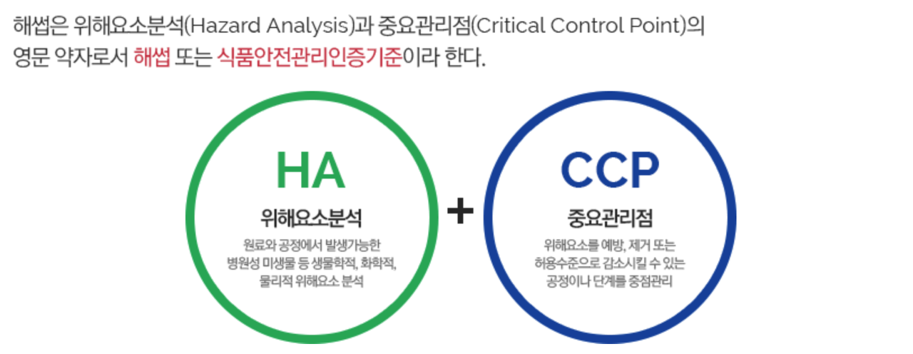 해썹(HACCP)란 식품의 원재료부터 제조, 가공, 보존, 유통, 조리단계를 거쳐 최종소비자가 섭취하기 전까지의 각 단계에서 발생할 우려가 있는 위해요소를 규명하고, 이를 중점적으로 관리하기 위한 위생체계다.