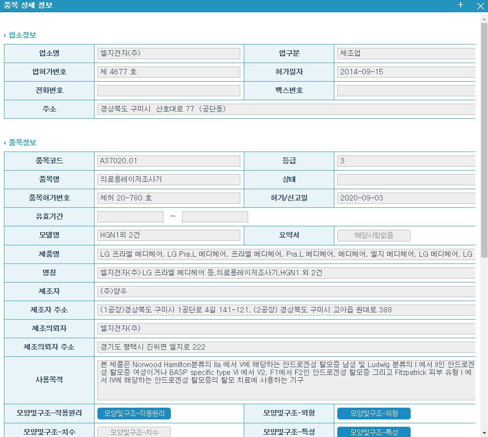 첫번째 사진의 내용을 보면 알겠지만 식약처자료에 탈모치료 기구라고 명시되어 있는 만큼 효과를 인정받았다고 볼 수 있는데 설명처럼 '안드로겐성'탈모증을 대상으로 효과를 발휘 한다고 되어 있다.
