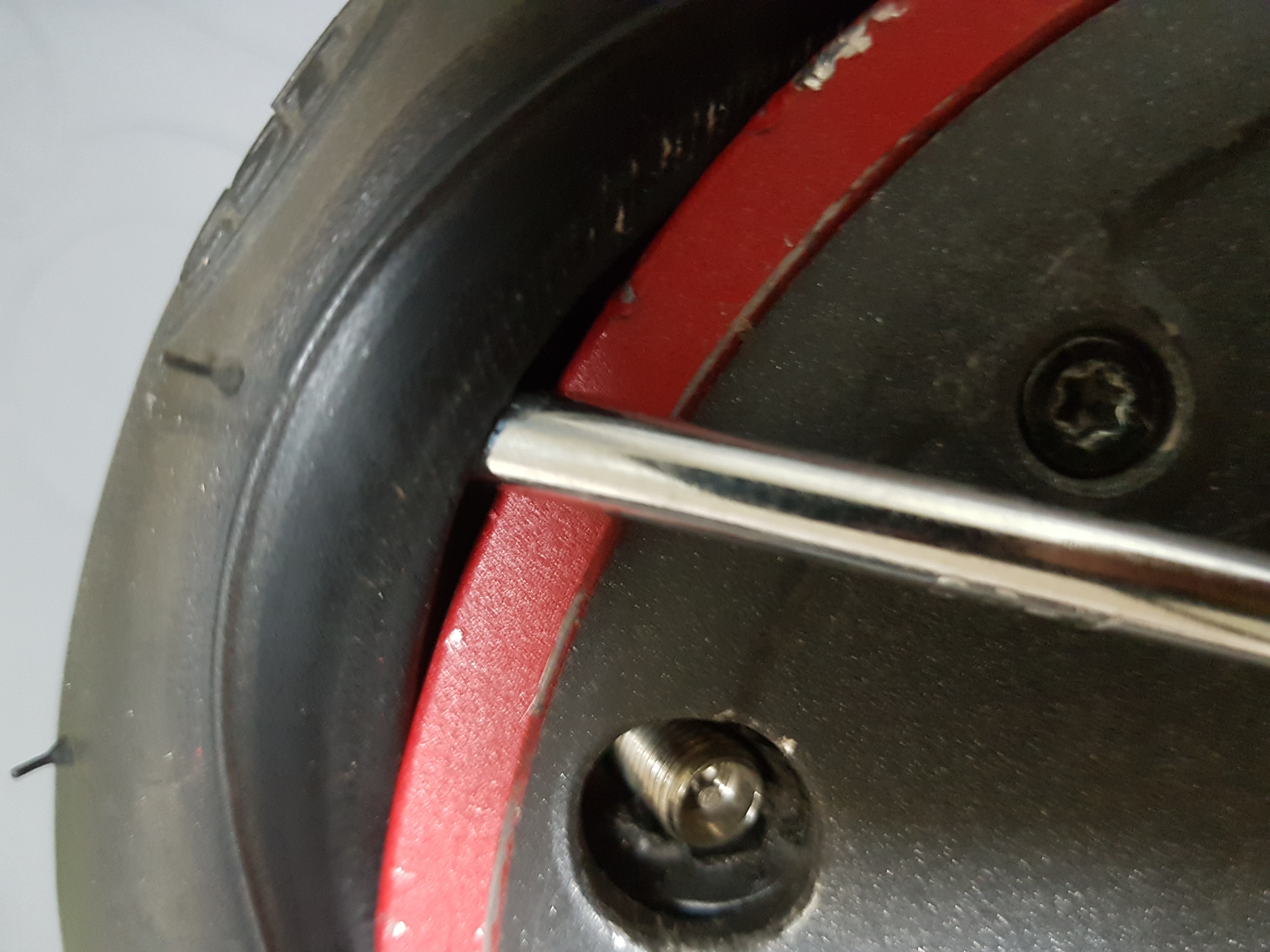 6. 타이어 처음 끼우면 첫번째 사진 처럼 걸쳐져 있는 상태라 마지막 사진처럼 드라이버하나로는 타이어를 위로 올려 공간을 만들어 아래쪽에 드라이버를 넣어서 안쪽으로 타이어를 밀어줘야한다.