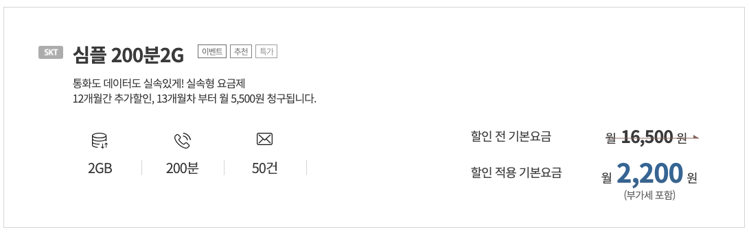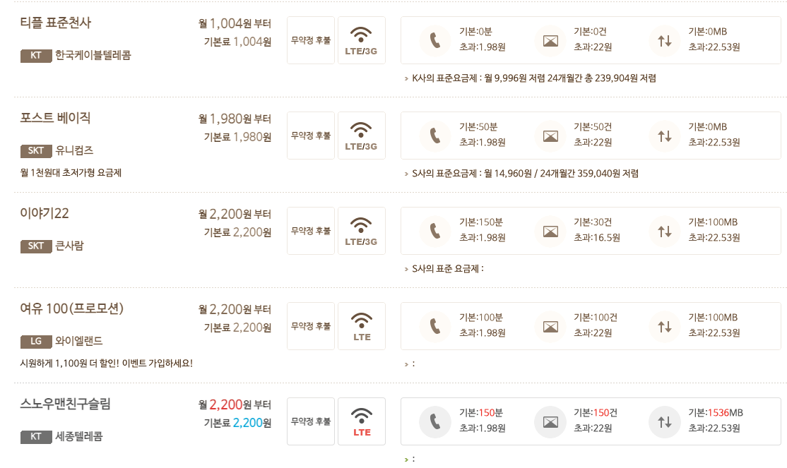 | 간단한 통화/데이터 | 통신망 : LGU+ 1. 프리티데이터 2.5G - 프리티 기본료 : 월 4,400원 (가입 후 12개월 동안 1,100원) 기본제공 : 2.5GB 100분 보러가기 2. USIM 스마트 심플 100분 + 1.5GB - 스마텔 기본료 : 월 6,000원 (가입 후 7개월 동안 0원) 기본제공 : 1.5GB 100분 100건 보러가기 * 동일한 조건에 1GB 200분 100건 상품도 존재 > 200분 상품 보러가기 통신망 : KT 1. 프리티데이터2G 기본료 : 5,500원(가입 후 12월 동안 2,200원) 기본제공 : 2GB 200분 50건 보러가기2. 스노우맨친구슬림 기본료 : 2,200원 기본제공 : 1.5GB 150분 150건 보러가기 통신망 : SKT 1. 심플200분2G 기본료 : 5,500원(가입 후 12월 동안 2,200원) 기본제공 : 2GB 200분 50건 보러가기 |