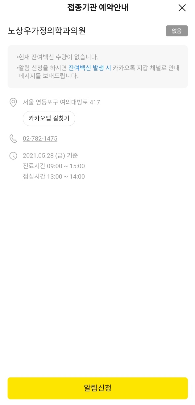 그리고 백신수량이 언제 생길지 모르기 때문에 우측에 있는 '알림신청'버튼을 눌러 신청을 하면 노쇼백신이 생길때 알림으로 알려줘서 보다 편하게 이용할 수 있다.