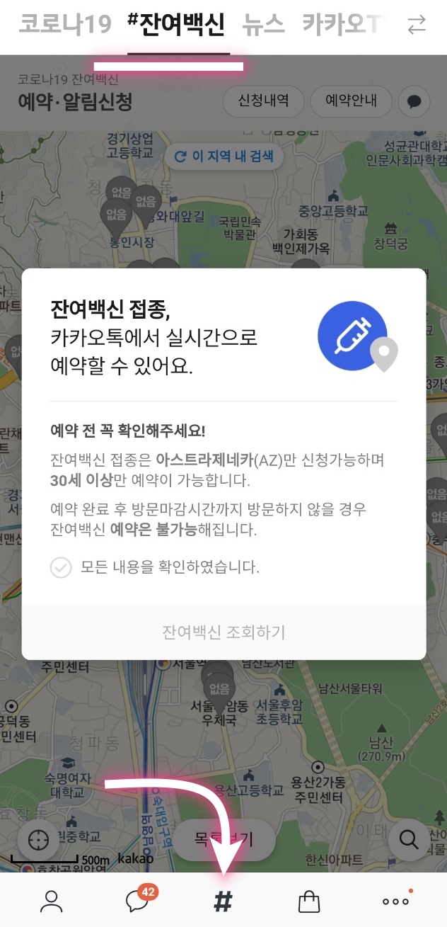 카카오톡 메뉴 중 #을 선택 후 '잔여백신' 메뉴를 누른 후 예약을 하면 된다.