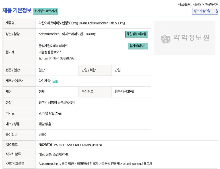 2. 다산아세트아미노펜정500밀리그램 / (주)다산제약