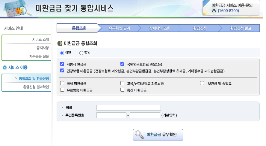 크게 8가지 종류의 미환급금을 조회할 수 있는 서비스를 제공해준다.