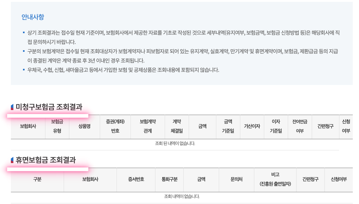 여기에는 중도보험금, 만기보험금, 휴면보험금, 생존연금 등이 해당되고 조회를 통해 확인할 수 있다.