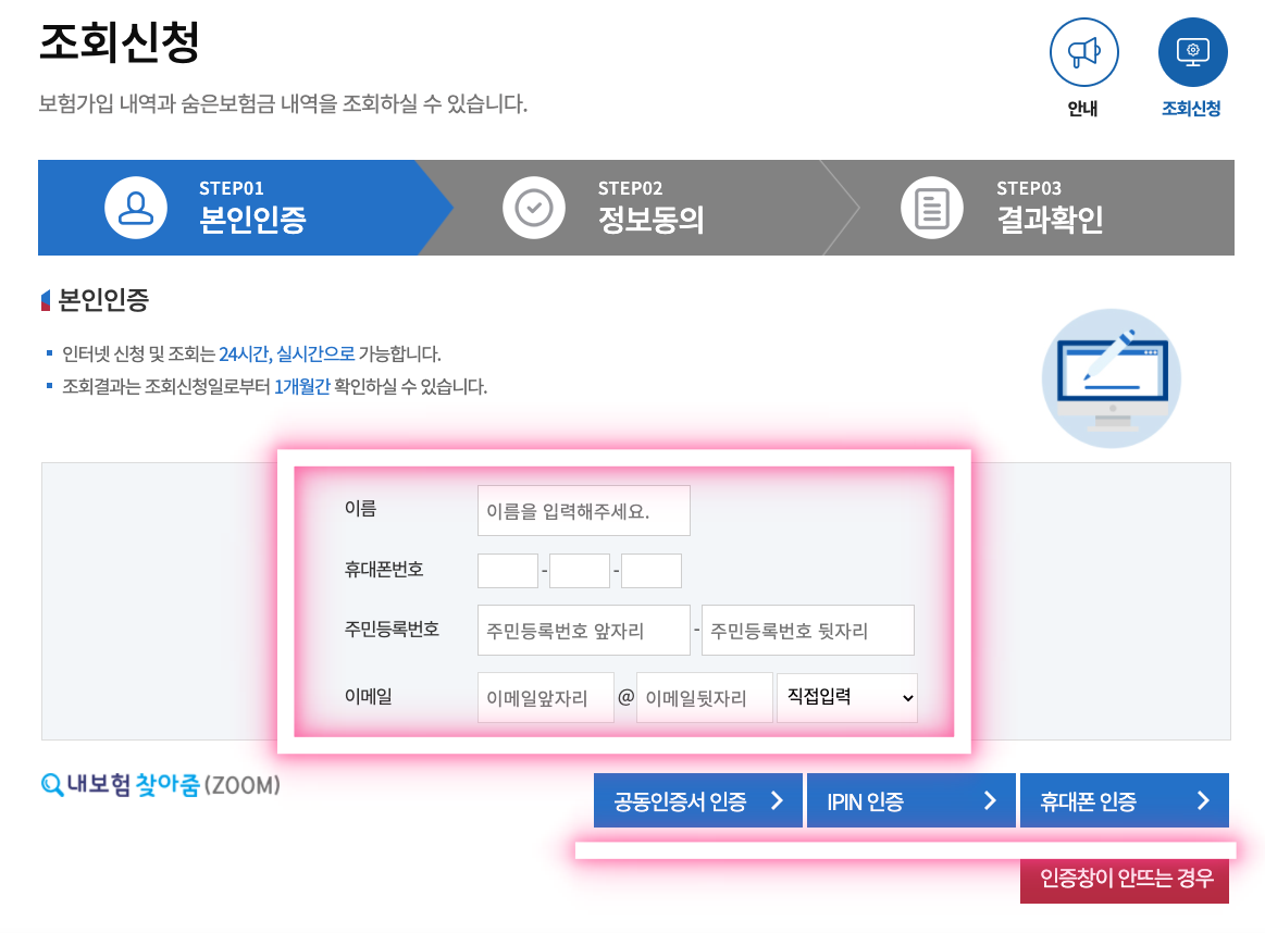 사이트 접속 후 보험금 조회하기를 누르면 되는데, '본인인증'을 위해 공동(공인)인증서 또는 핸드폰, 아이핀을 통해 인증해야 하다.