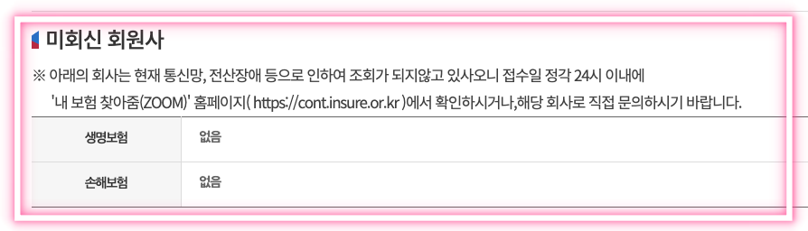 내보험찾아줌 주의점으로 제일 아래에 '미회신 회원사'라고 표시가 되어있는데 만약 여기에 '없음'이 아닌 특정 보험회사가 표시된다면 해당 보험회사로부터 정확한 정보를 받지 못해 알 수 없는 상태를 뜻한다.