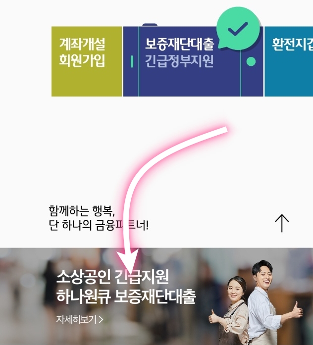 하나원큐 기업앱을 실행하면 제일 아래에 [소상공인 긴급지원 하나원큐 보증재단대출]이라고 되어 있는 부분을 선택하면 된다.