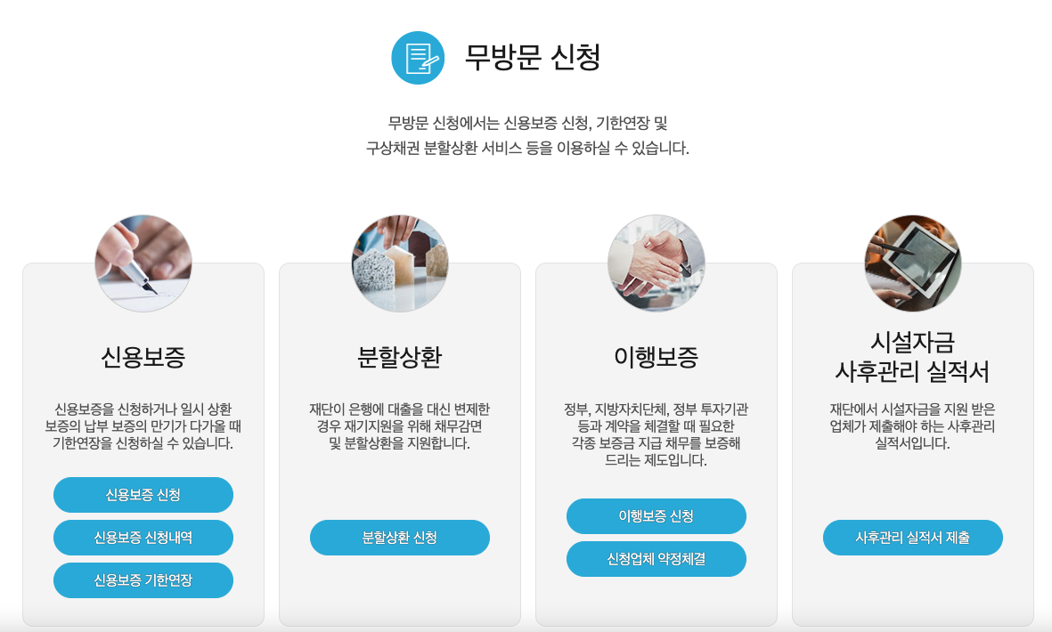 - 서울신용보증홈페이지 접속 > 무방문 신청하기 > 신용보증신청 > 체크리스트 작성 > 전화상담 및 서류안내 > 현장실사 및 약정 > 보증승인 > 은행방문