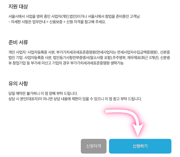 안내문구를 확인 후 '신청하기' 버튼을 눌러 정해진 안내에 따라 진행을 하면 된다.