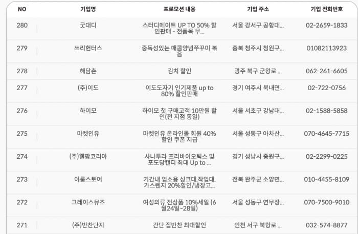 실제 동행세일 홈페이지에 있는 행사정보로 많은 업체들이 있다.