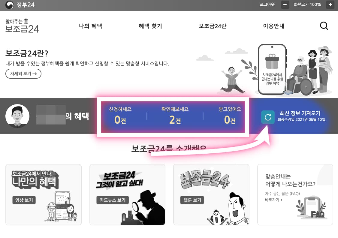 여기서 본인이 받고 있는 보조금 관련 정보를 알 수 있고 신규로 조회를 하기 위해선 첫번째에 보이는 '신청하세요' 또는 '최선정보 가져오기'를 누르면 본인에게 해당되는 보조금이 조회 된다.