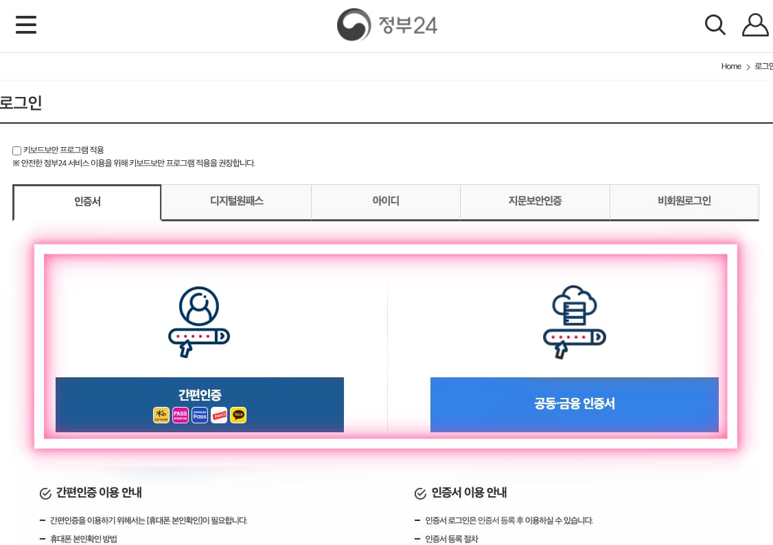 어느 사이트와 마찬가지로 공인/공동인증서가 있어야 제대로 조회도 하고 신청을 할 수 있다.