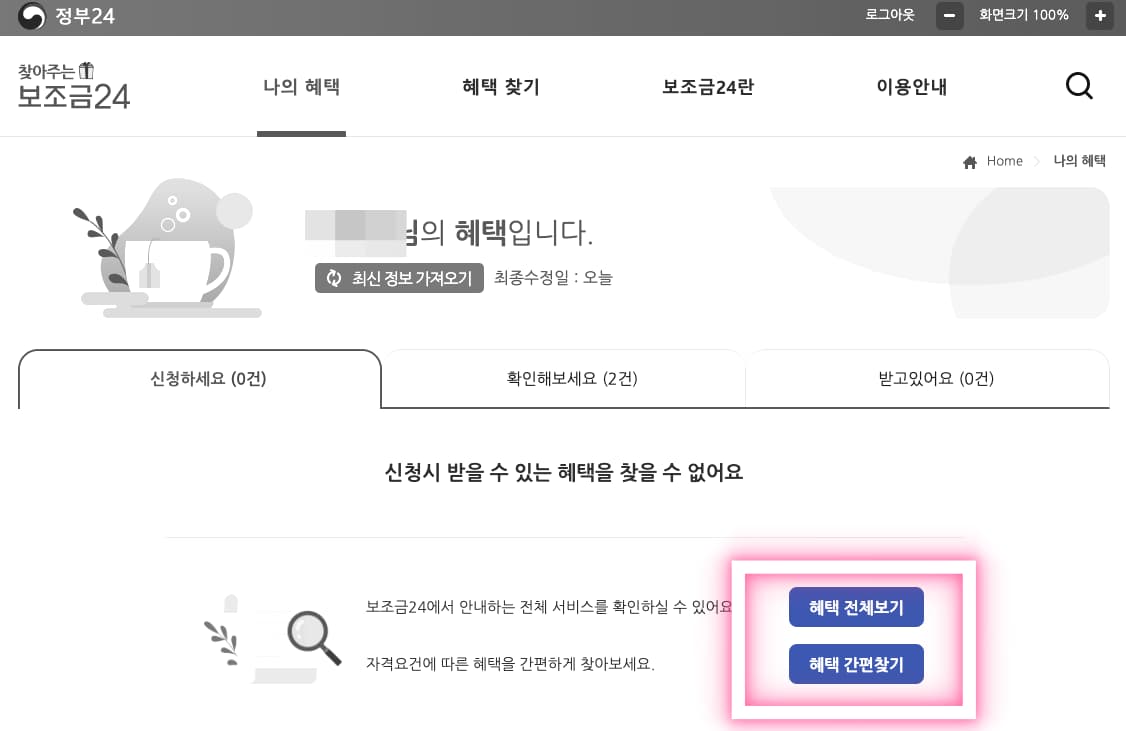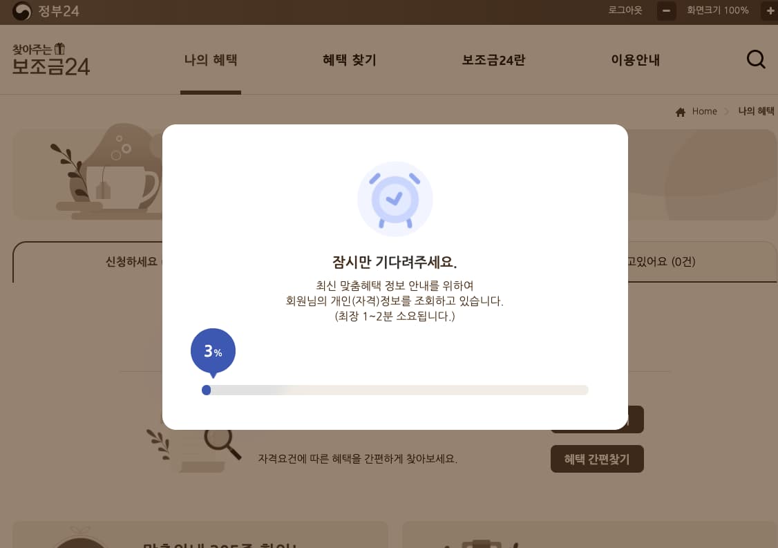 조회를 누르면 첫번째 사진처럼 진행 사항을 할 수 있고 신청이 가능한 보조금이 없다면 가운데 사진처럼 [신청시 받을 수 있는 혜택을 찾을 수 없어요]라는 문구가 표시된다.