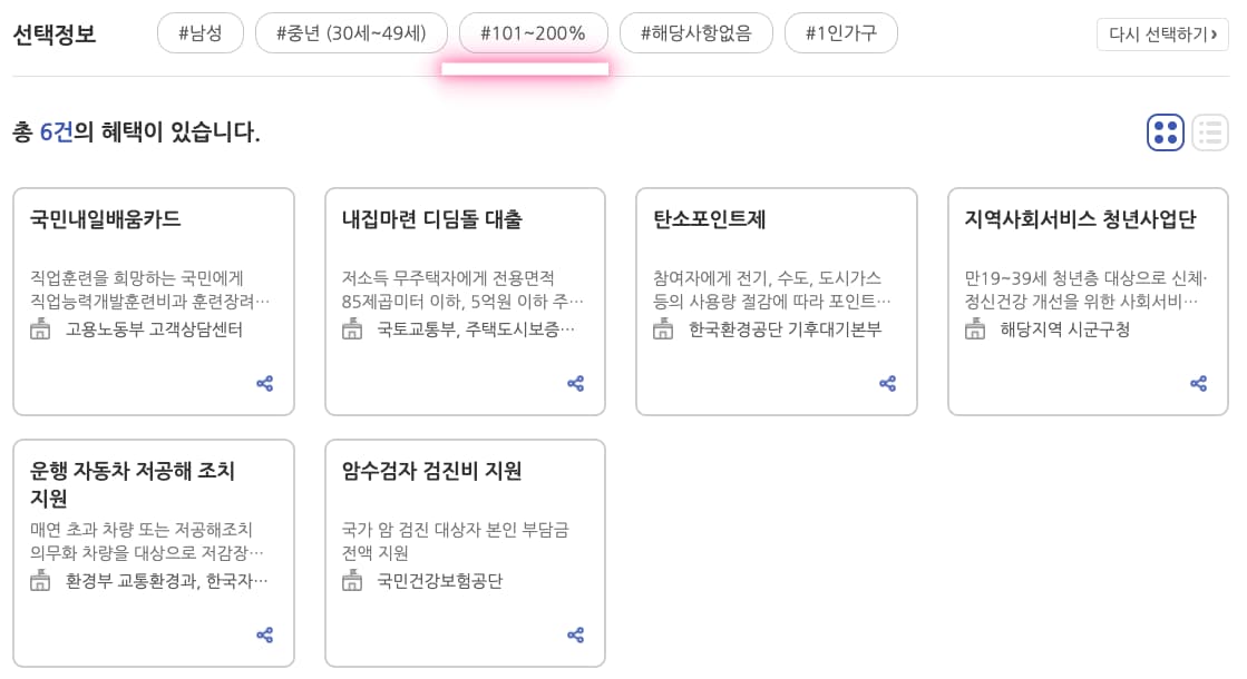 쉽게 말해 한눈에 본인이 받을 수 있는 정부의 지원제도를 알 수 있어 정말 유용한 사이트인데 생각보다 홍보가 잘 되고 있지 않아서 블로그에 작성하게 됐다.