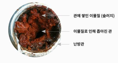 물만 있어야할 배관에 이러한 찌꺼기들이 쌓이면 당연히 온도를 전달해주는 물의 순환에 방해가 되서 난방의 효율이 떨어진다.