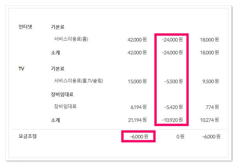 참고로 인터넷 + 티비 + 핸드폰 결합으로 위와 같이 각종 혜택을 받고 있다.