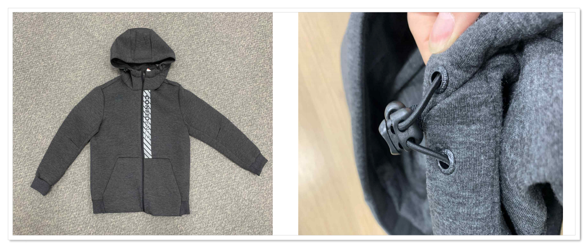 - 측정값 : 후드 및 허리의 조임끈에 빗장박음 봉(bartacking)이 되어 있지 않음