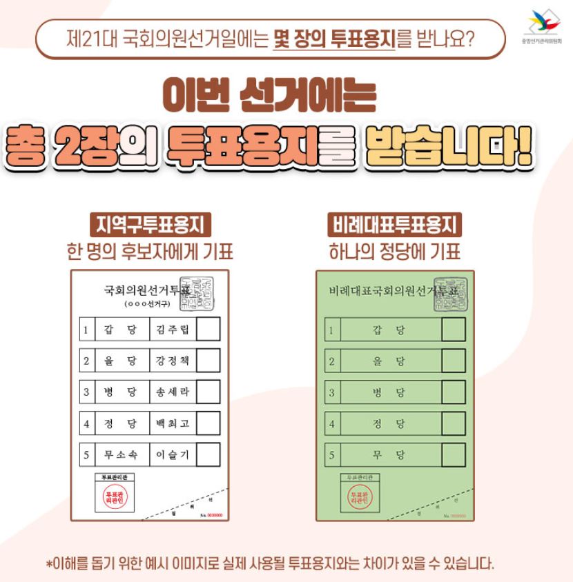 즉, 이번 총선에는 지역구와 비례투표 2장의 투표용지를 받게 되고 본인이 선호하는 후보자 / 정당에 투표를 하면 된다.