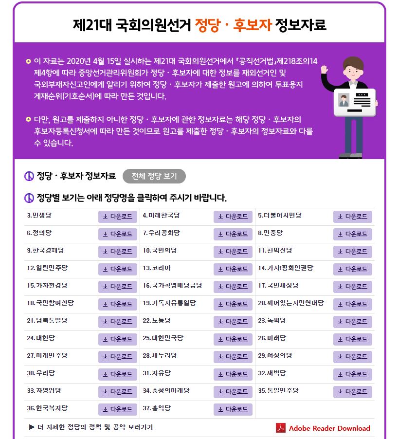 2. 위의 사이트 접속 후 원하는 정당 선택 후 자료 다운로드