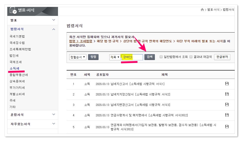 서식다운로드방법 : 국가법령시스템 > 장애인검색 > 장애인서식 다운로드 및 출력