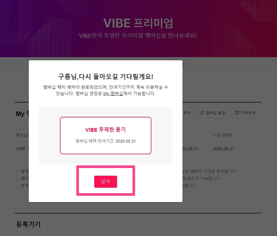 끝으로, 닫기 버튼을 선택하면 되고 "My 멤버쉽" 화면 아래에 다음 결제일 부분이 "멤버쉽 연장"으로 보인다면 정상적으로 해지가 된 상태니 걱정하지 않아도 된다.