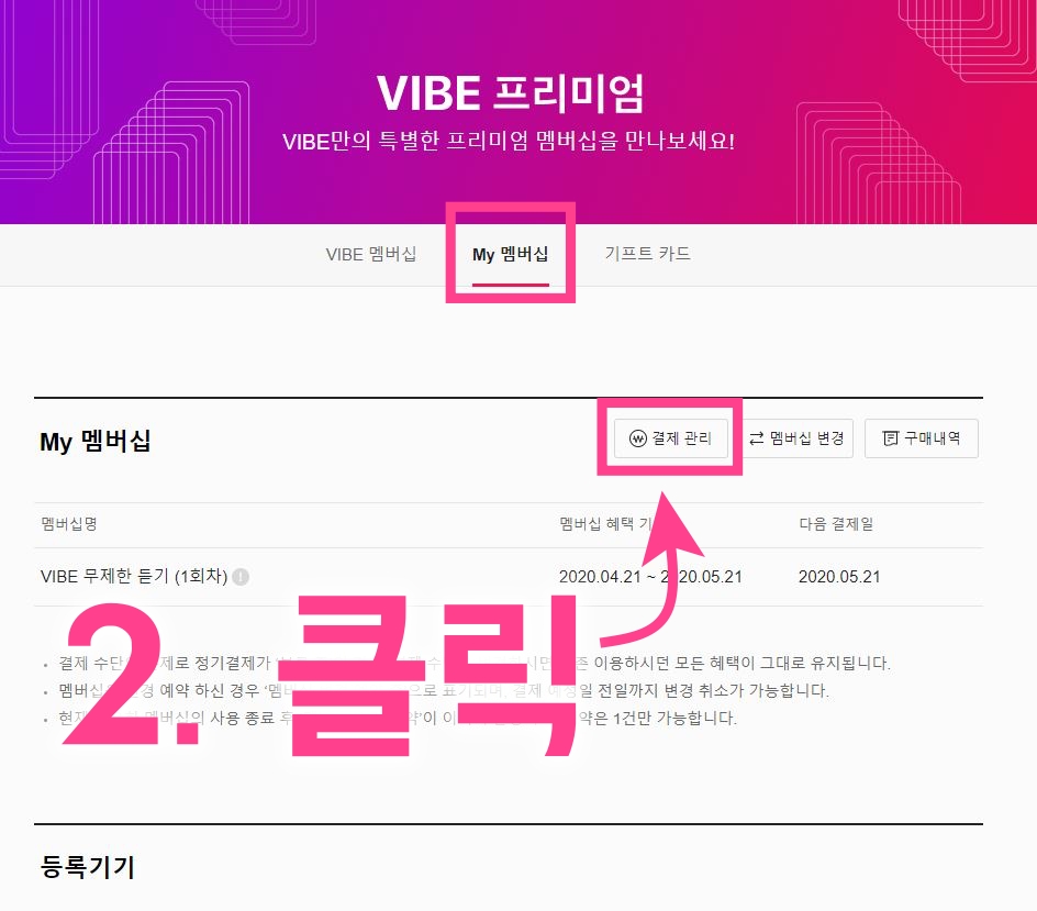 2. 3가지 탭 메뉴 중 "My 멤버쉽" 을 선택하고 "결제 관리"를 클릭합니다.