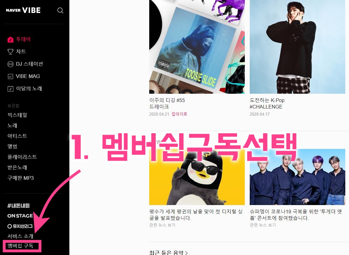 1. 네이버 바이브 접속 후 로그인 후 좌측 메뉴 아래 "멤버쉽 구독" 선택