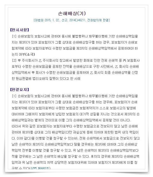 대법원 판례 2014다 46211, 이 판례가 자동차 보험은 아니고 화재보험에 대한 판례라 해당 안된다는 이야기가 있는데 화재보험과 자동차 보험 모두 "손해보험"보험이고 1심과 2심에서도 이 대법원 판례를 인용하고 있다.