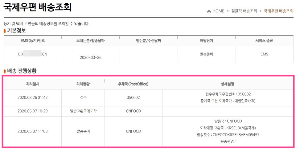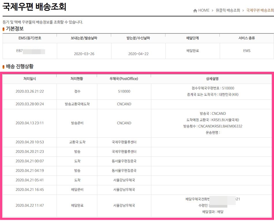 배송조회를 하면 위의 화면처럼 EMS 배송진행 단계가 순서대로 표기가 된다.