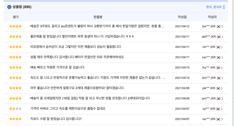 전동킥보드의 경우 AS 센터 위치가 정말 중요하다. 킥보드는 배송비가 1~2만원 단위다 생각보다 고장이 잘나고 타이어 교체하는것도 보통 힘든일이 아니다. 자전거를 생각했다면 큰 오산! 필히 AS센터가 근처에 있는지 확인을 해야하고 부품수급이 쉬운제품(유명한제품)이 좋다. |