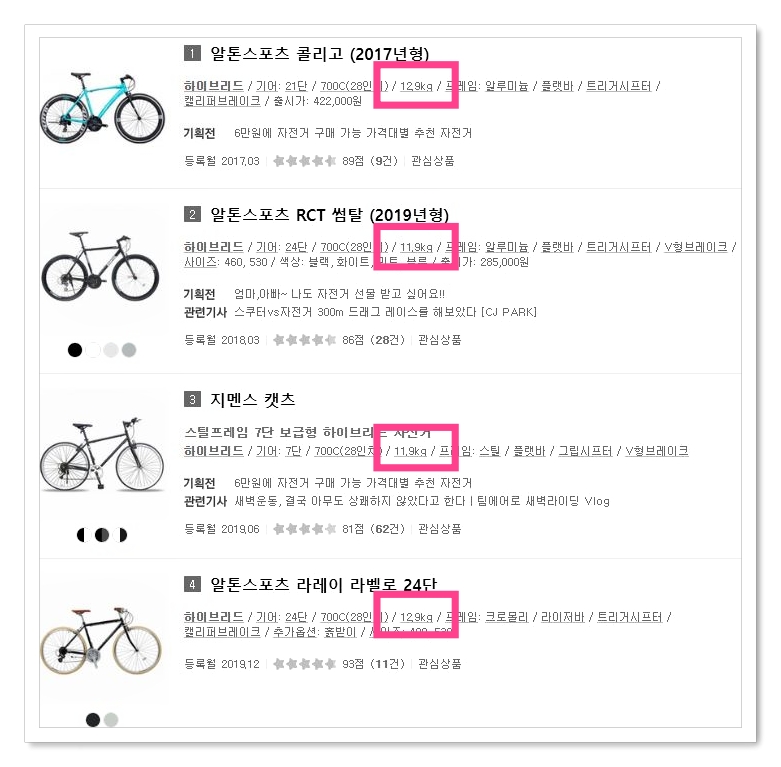 그러니 쉽게지나치는 "자전거 무게"를 집중해서 보자.