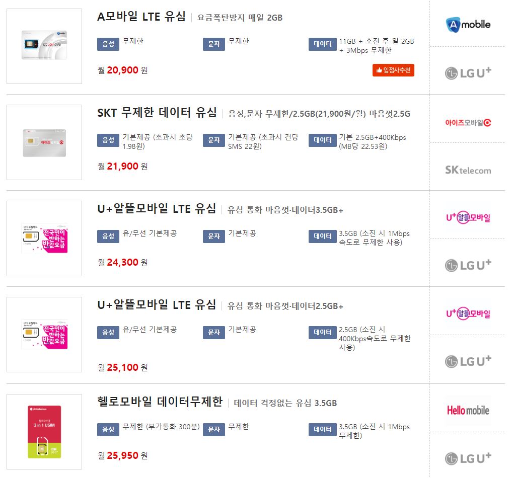 * 가격을 보면 알겠지만 메이저 통신사대비 통신료가 50%이상 저렴하다.